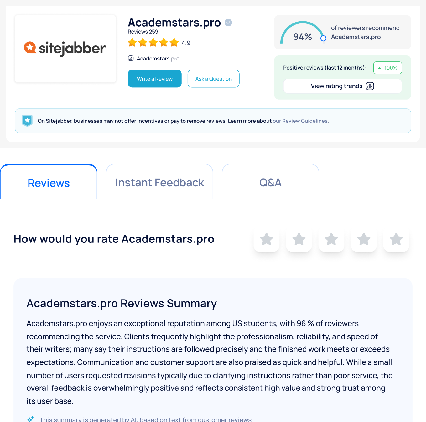 Experts and long-term users alike rate academstars.pro between 4.7 and 5 stars out of 5, citing its reliability, human-written content, and dedication to academic excellence.