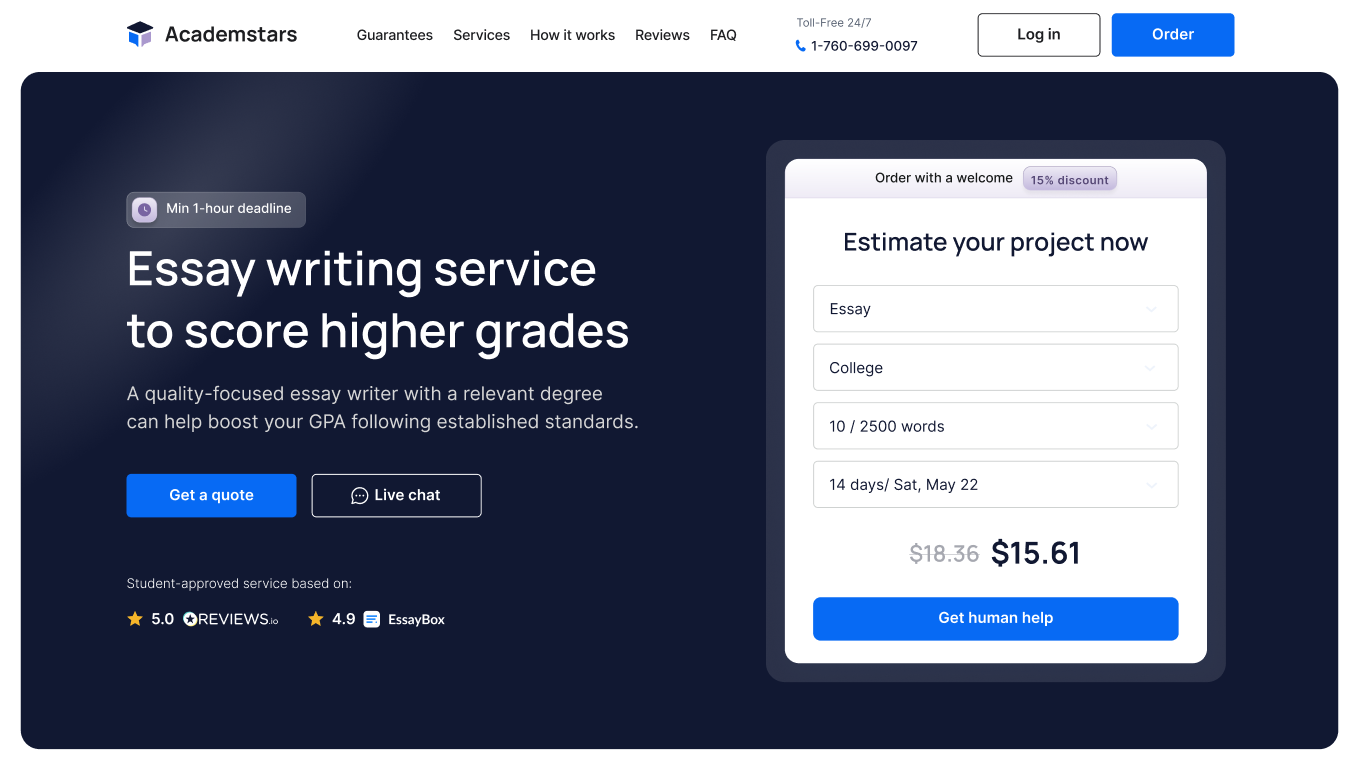 This service is well-known for its affordable prices. The lowest price for a simple essay (up to 3 pages, no rush with delivery) is just 14.99 USD. As with any similar service, the faster delivery you want or the higher complexity of your task – costs will go up significantly, sometimes going beyond the 40 USD threshold for an urgent 4 hours assignment. Expect first-order discounts and occasional promotions on holidays and seasonal sales.